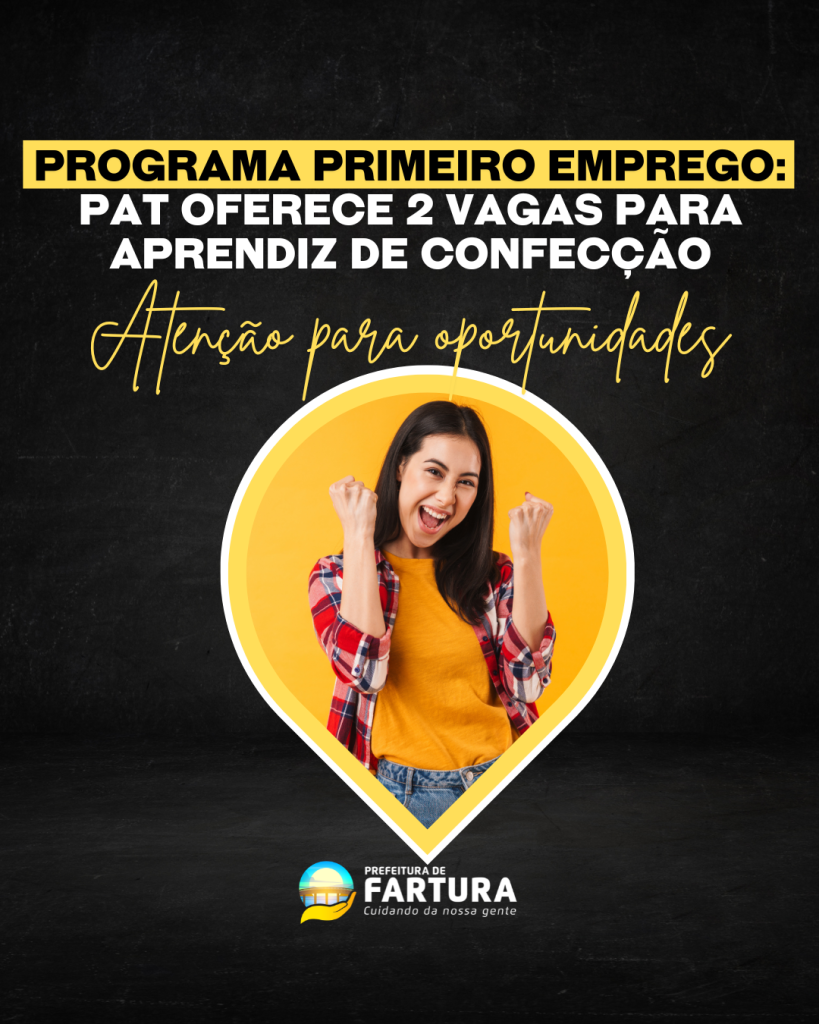 A equipe da Coordenadoria de Indústria, Comércio e Emprego, de Fartura, divulgou por meio do Posto de Atendimento ao Trabalhador (PAT), que há 2 vagas para aprendiz de confecção disponíveis. O interessado deve ter mínimo 18 anos. O órgão informa que as oportunidades fazem parte do Programa Primeiro Emprego.